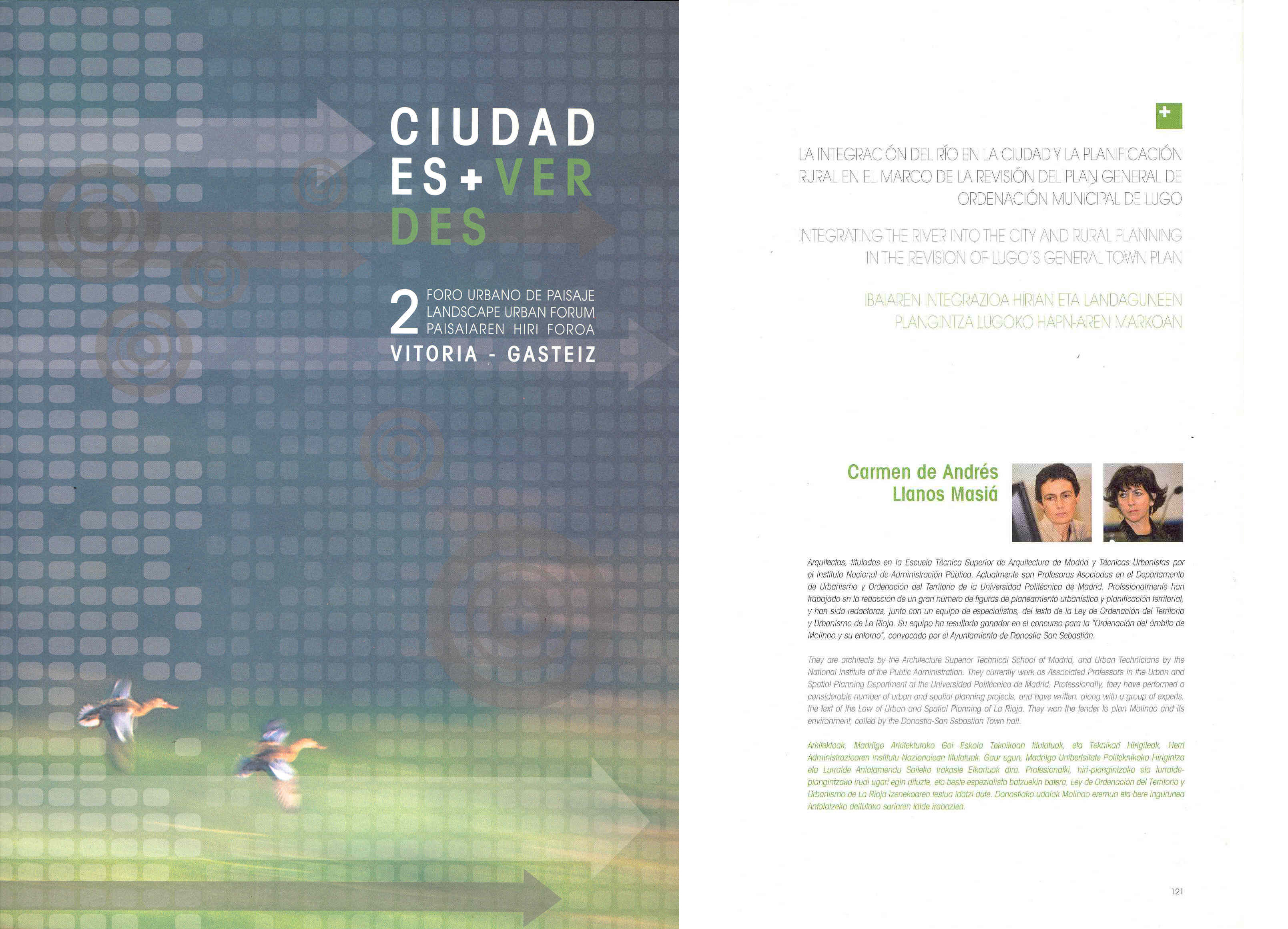 Integración del río en la ciudad y la planificación rural en el marco de la revisión del Plan General de Ordenación Municipal de Lugo, publicado en el libro Ciudades + verdes. 2 Foro urbano de paisaje,. Centro de Estudios Ambientales del Ayuntamiento de Vitoria-Gasteriz.2009. Depósito legal: VI-270/09.
